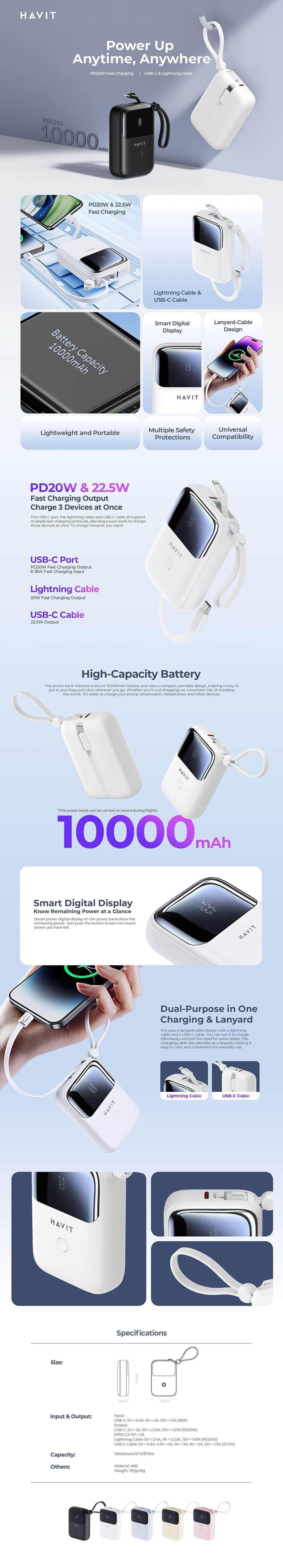 Charge faster, carry less, and stay in control with the HAVIT PB5215 — the smart 10000mAh power bank with a built-in display, built-in cables, and PD 20W fast charging.