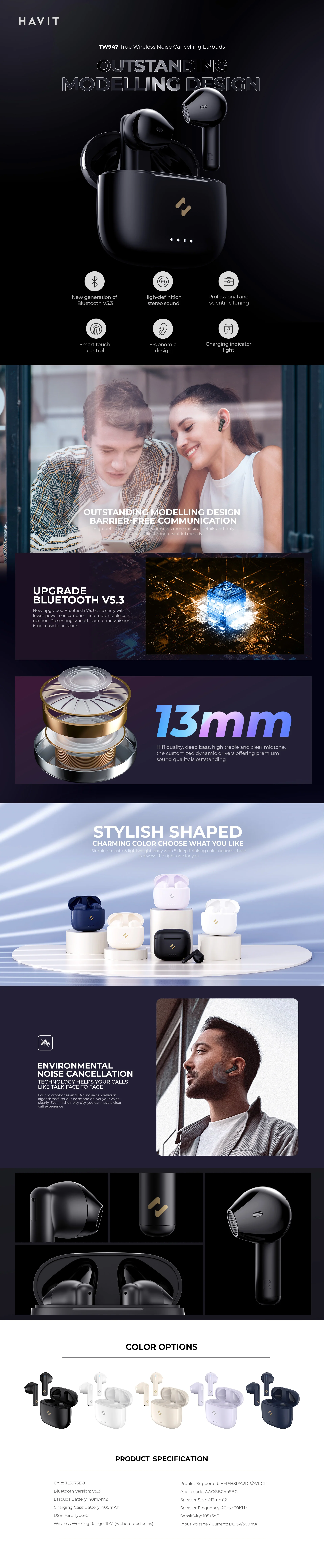π§β¨ Havit TW947 Wireless Noise-Cancelling Earbuds β Bluetooth 5.3 | 13mm HiFi Sound | ENC Clear Calls